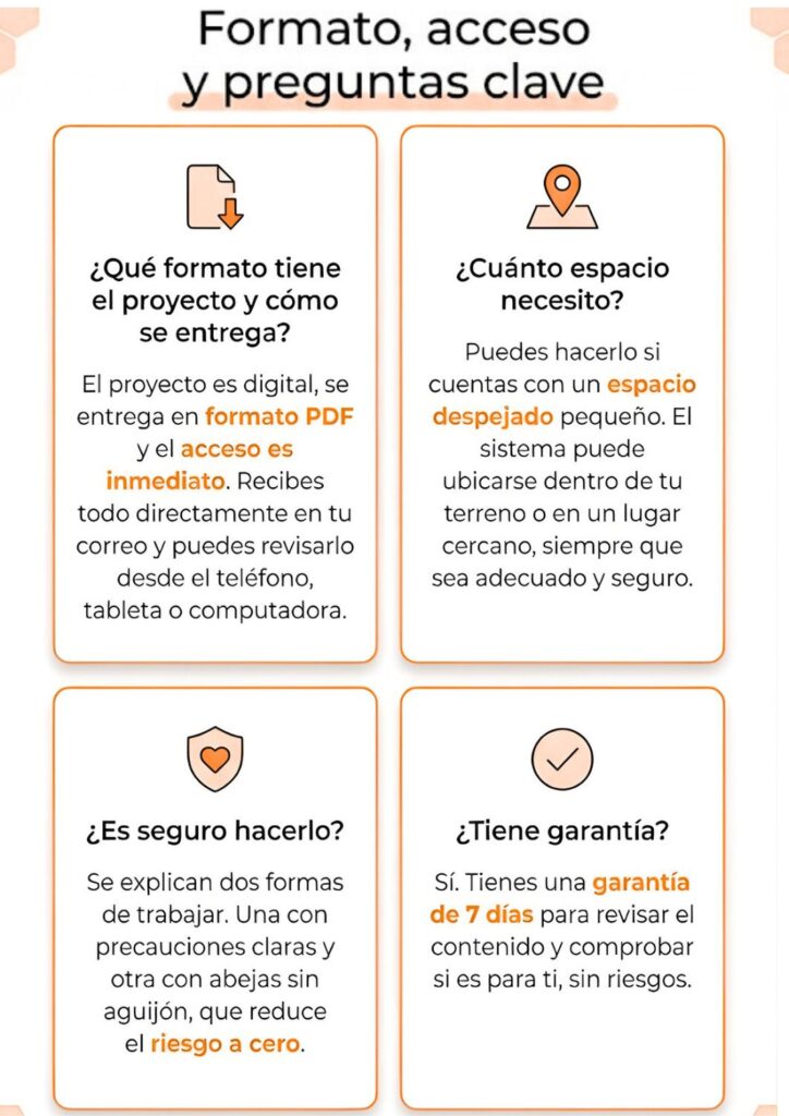 Tienes 7 días de garantía. Hoy PUEDES EMPEZAR TU PROYECTO DESDE CASA, tener miel de calidad medible y rentabilidad si deseas aplicarlo como negocio.
